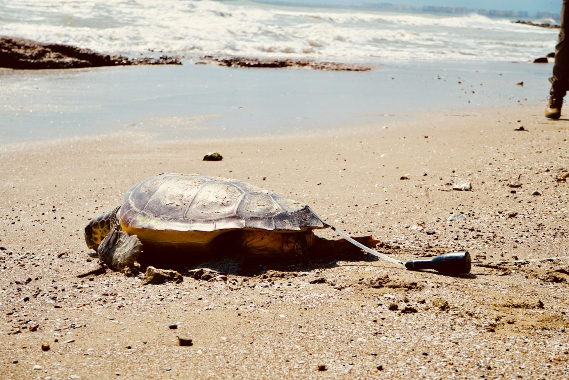 Tortuga marina con emisor satelital entrando al mar tras recuperase en la Fundacioìn Azul Marino (Medium)