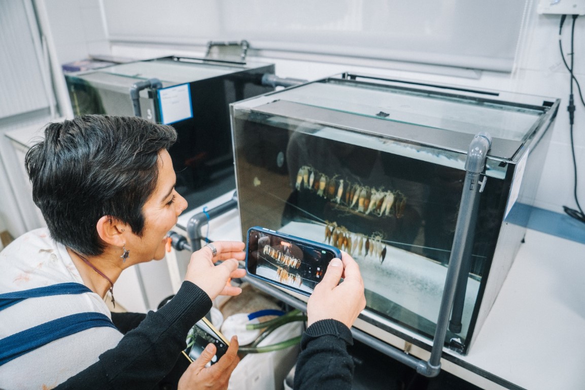 Una participante del congreso observa huevos de tiburoìn recuperados de pesca de descarte (Medium)